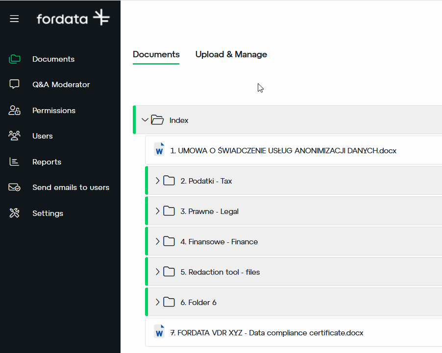 This function allows for uploading documents to the entire structure or selected areas, as well as enabling the management of this structure, including renaming documents and folders, changing their location, creating new folders, deleting, and downloading content (without protections) (GIF 2).