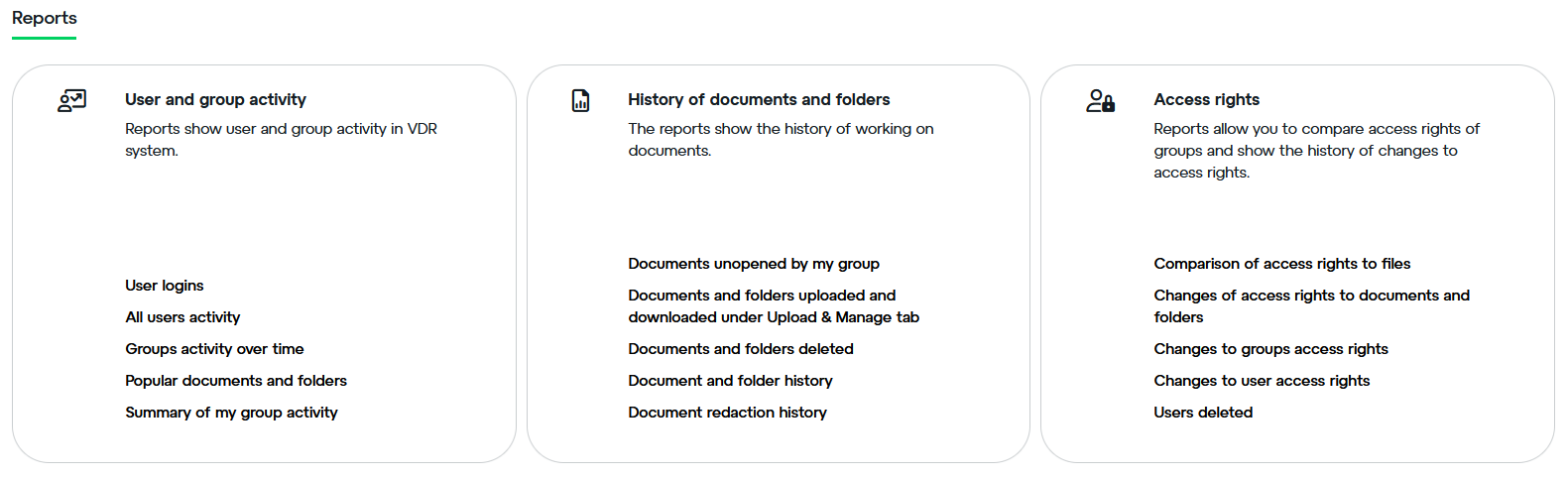 n this article, you will learn about the features that will allow your group to manage selected areas in the VDR (Virtual Data Room).