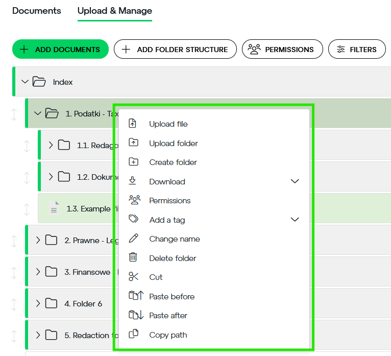 - If you wish to make changes to the structure, navigate to the Documents > Upload & Manage tab, then right-click on the selected item (folder or file) to display a list of management options.