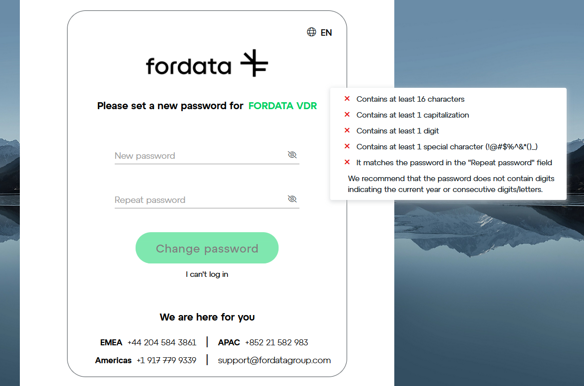 In the email you receive from Fordata (fig. 1), you will find a button labeled Set up account. Click on this button to be redirected to the Virtual Data Room project page (fig. 2), where you will set up your own password.