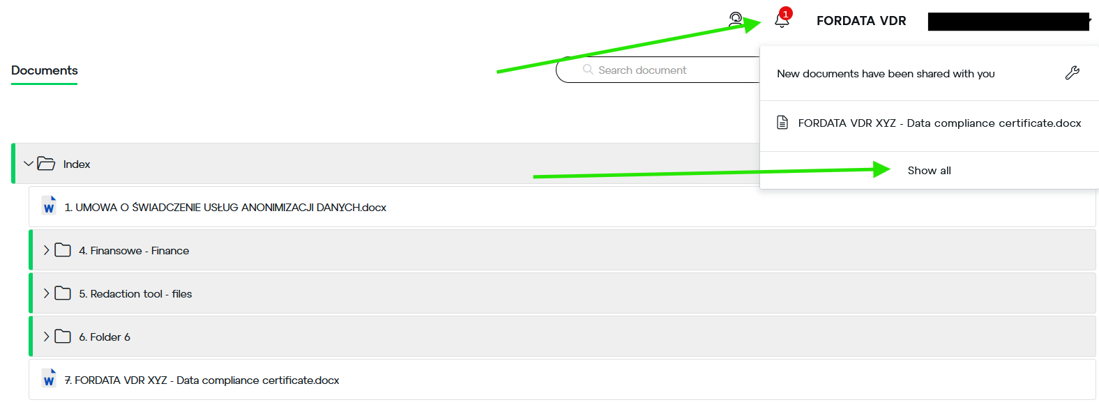 In the VDR system, you have two types of notifications regarding newly shared documents.
