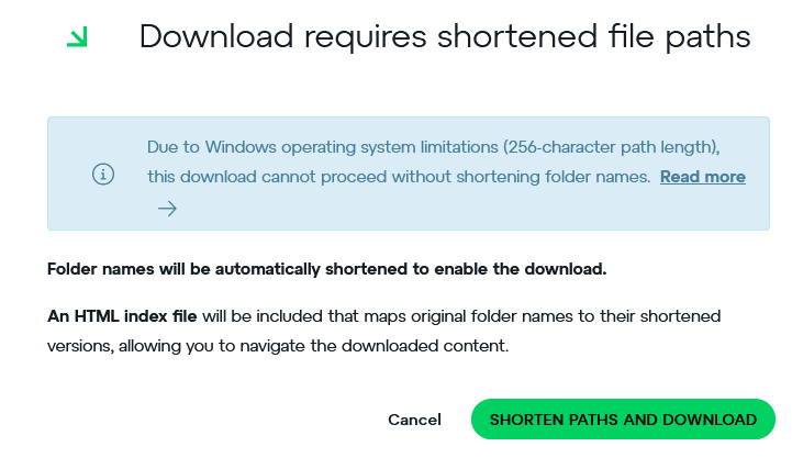 Learn how to proceed when the path length of downloaded files exceeds your computer's operating system limits.